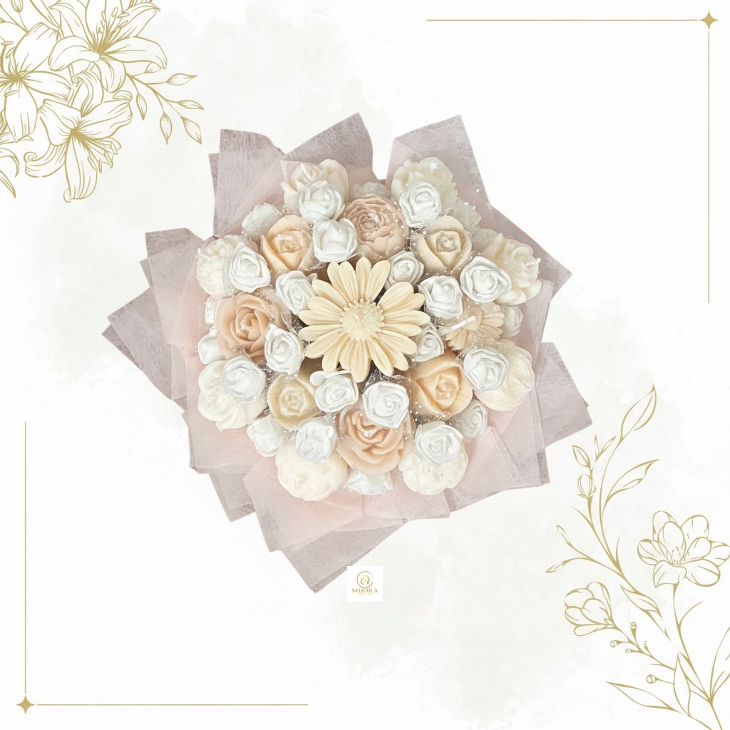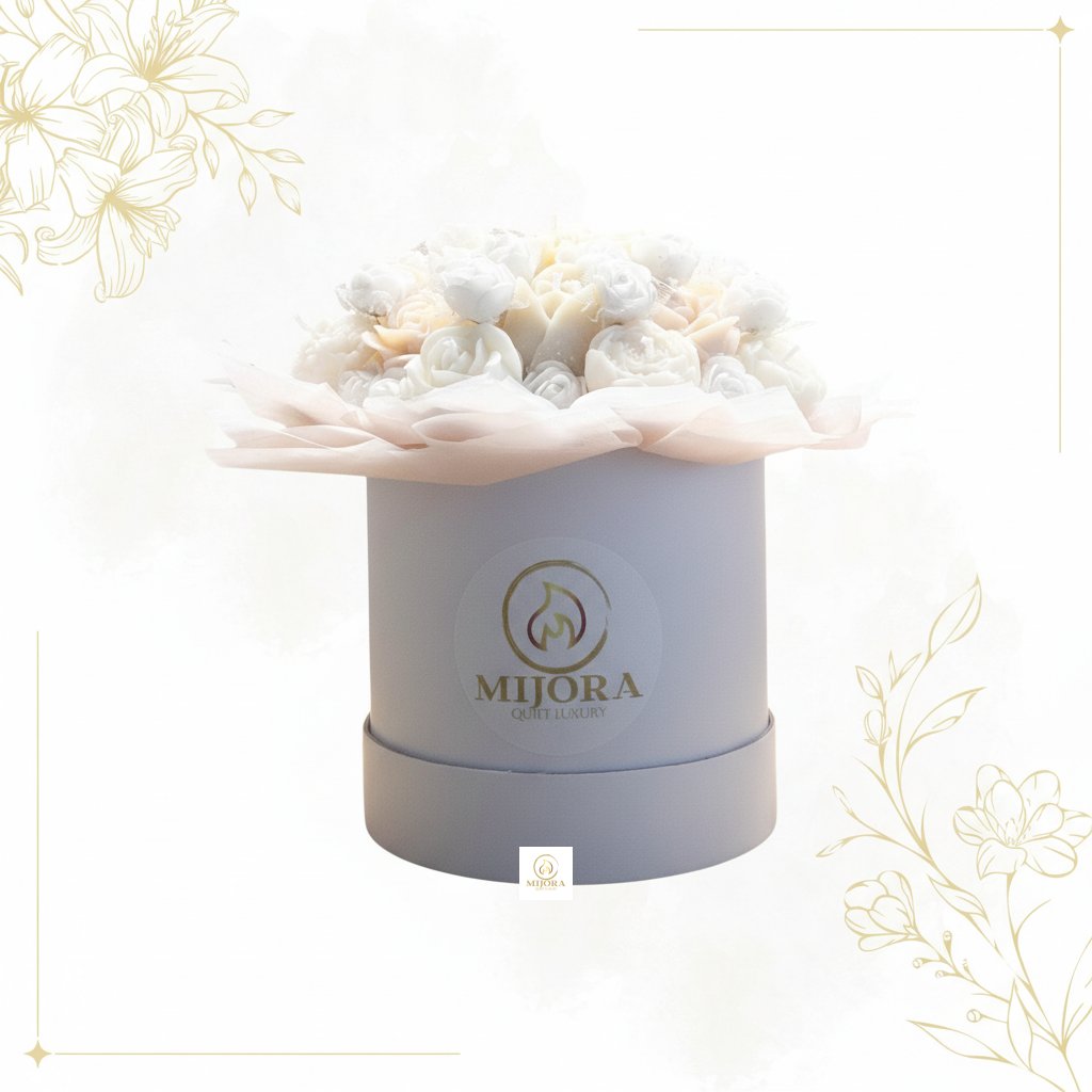Exkluzivní kytice ze svíček v jemných bílých a krémových tónech, ručně vyráběná z kvalitního sójového vosku. Symbol čistoty a elegance – ideální jako luxusní dárek na svatbu, MDŽ, výročí, narozeniny nebo jako vkusné poděkování.